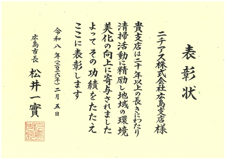 このたび広島支店は、地域における環境美化活動への継続的な取り組みが評価され、「団体の部 環境美化永年活動20年表彰」をいただく運びとなりました。