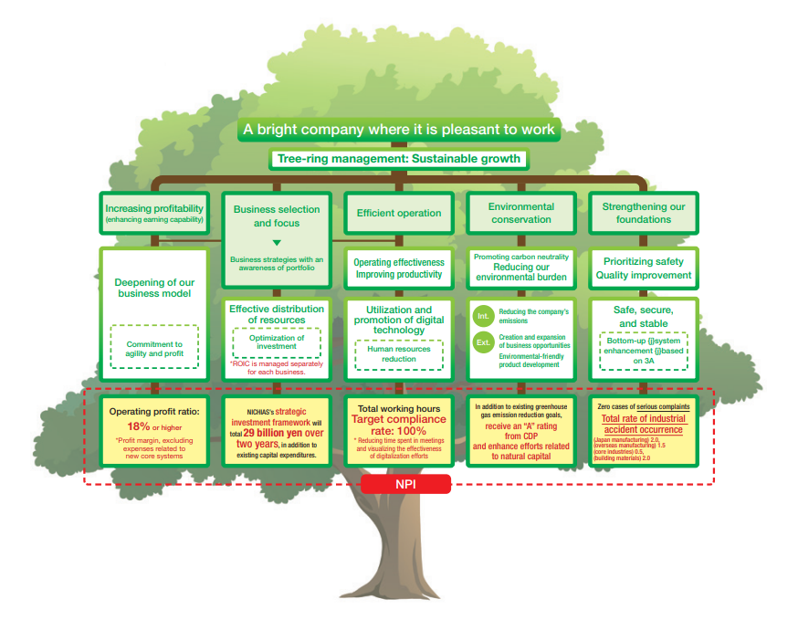 NICHIAS has outlined numerical targets as NICHIAS Performance Indicators (NPI) and will continue to promote efforts for the five challenges above.