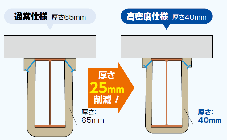 厚さ25mm品で約40%(40mm⇒25mm)、厚さ40mm品も同様に約40%(65mm⇒40mm)低減できます。