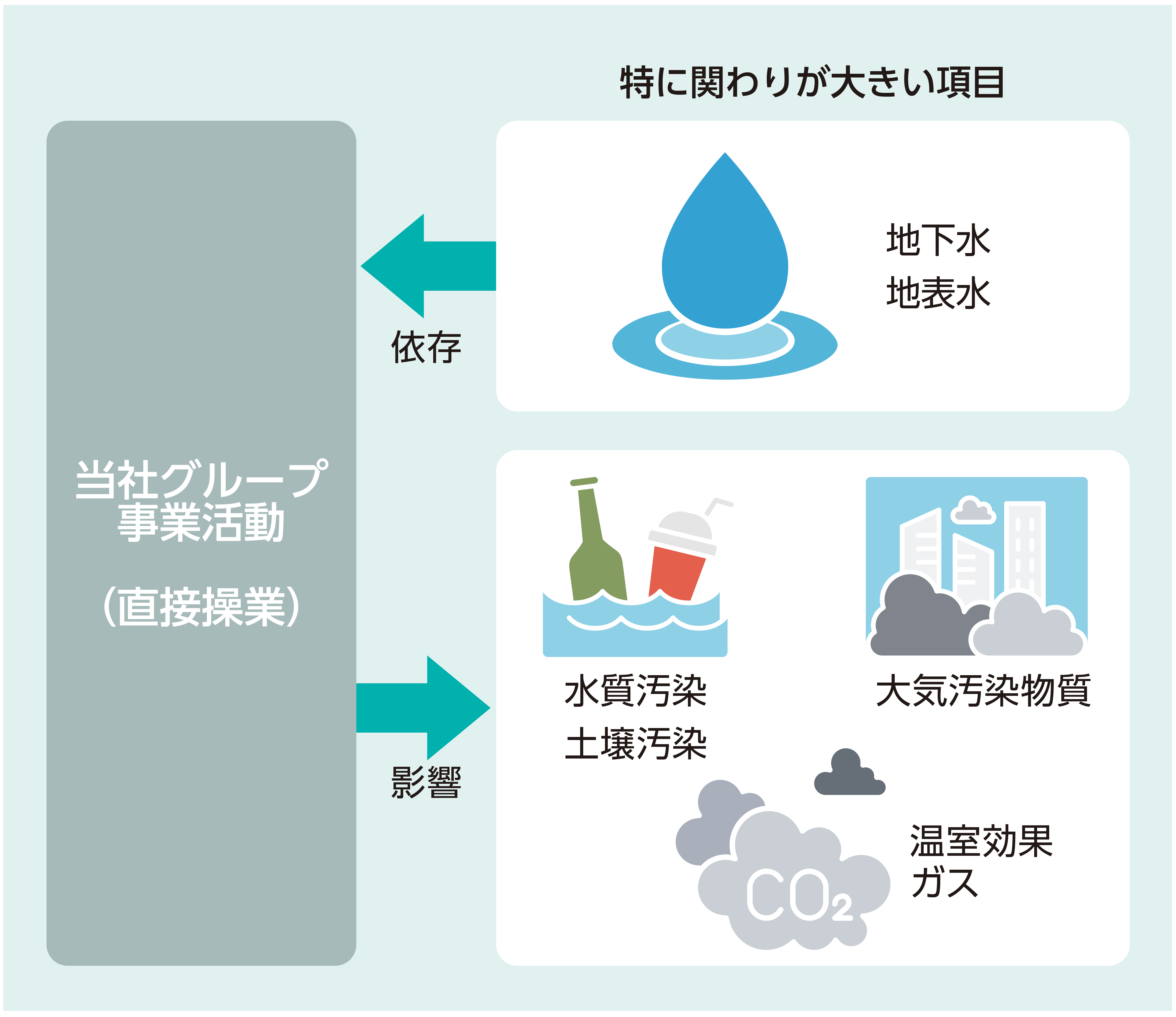当社グループは、原材料の調達や製品の製造などの事業活動を通じて、自然資本に依存し、影響を与えています。当社の多くの製品で天然鉱物を原材料としていることから、原材料採掘などが当該地域の生態系になんらかの影響を及ぼしていると考えています。
