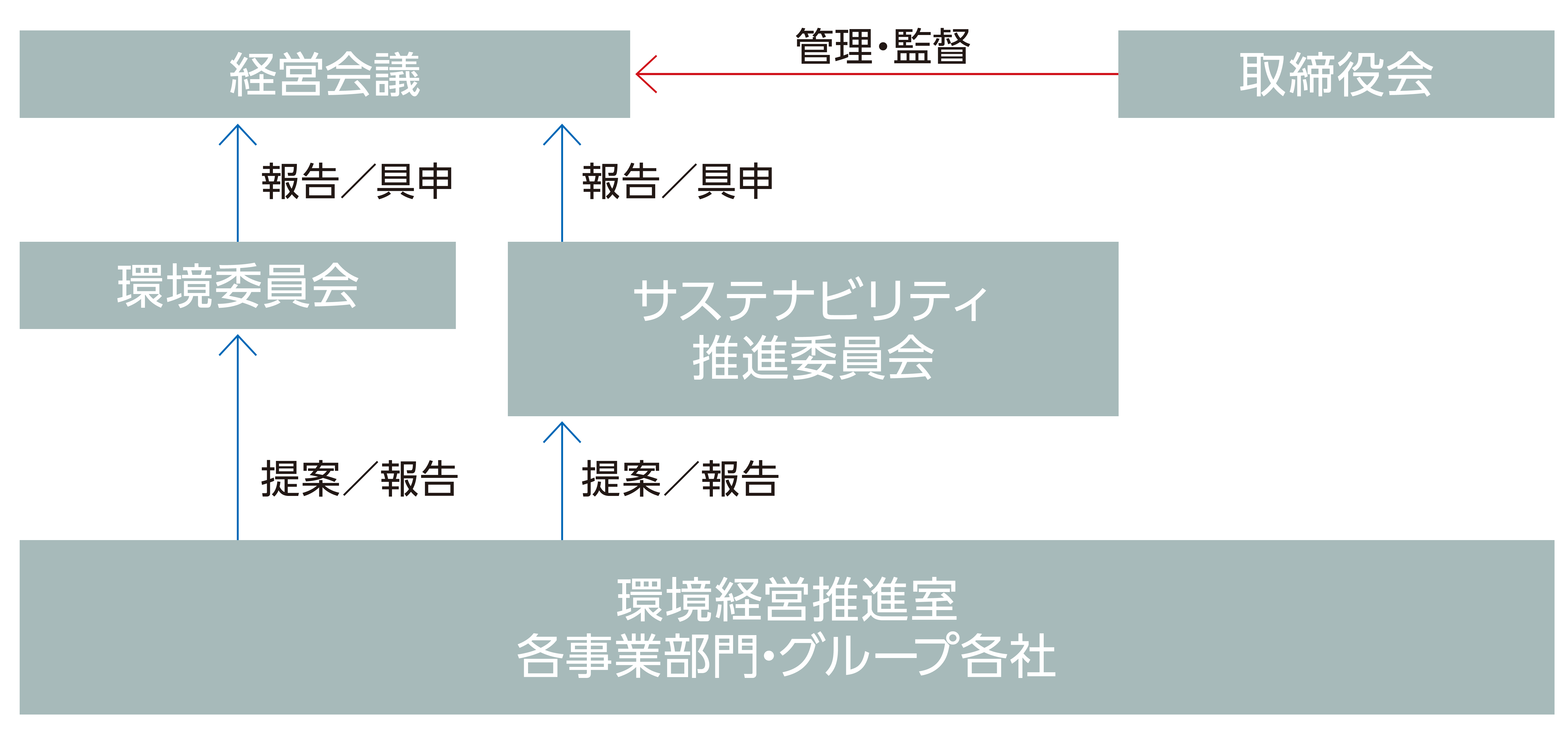 気候変動・自然関連に関わる課題や、機会とリスクの評価は、環境経営推進室が中心となって各事業部門・グループ各社と協議し、サステナビリティ推進委員会および環境委員会に提案、報告します。サステナビリティ推進委員会はサステナビリティ担当役員を委員長とし、毎月開催されます。環境委員会は代表取締役社長が委員長を務め、四半期に1回開催されます。環境委員会では、目標・方針設定、戦略策定および取り組み状況などを審議し、審議事項は取締役会で管理・監督しています。